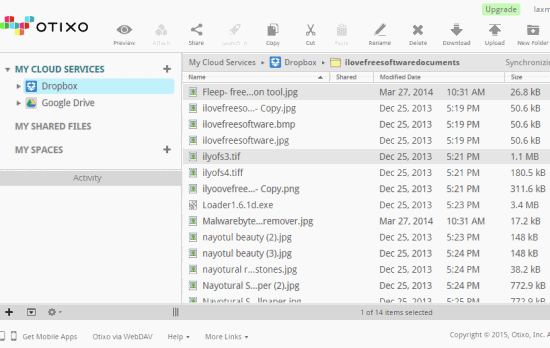 Next website in this list is Otixo. It supports more than 20 services to manage from a single platform: Box, Picasa, Yandex, OneDrive, Amazon, OwnCloud, Facebook, FTP, WebDAV, HiDrive, Flickr, etc. Once you have connected the services, you can perform all necessary options to manage your accounts. You can preview files, download them to PC, upload files, delete files/folders, create new folder, share files with people, etc. For sharing the files, it lets you set expiration days and password. This feature is really interesting.