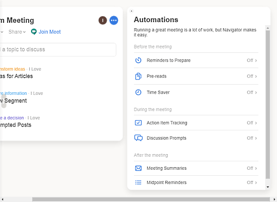 Navigator is a useful suite that solves addresses the usual issues in remote meetings. It helps you prepare for meetings and have all the important stuff right in your reach. Instead of putting the meeting burden on individuals, it helps you spread that throughout the team so everyone can do their part. The meeting workspaces along are amazing and automation and integration just make it the best solution you can get to organize your meetings for maximum output.