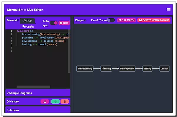 This tool also provides a direct link to open the generated diagram in the Mermaid Live Editor. Clicking that link takes you to the Mermaid Live Editor with the diagram code already inserted there. There you can use the editor to edit and customize the code. This editor allows you to customize the appearance of the diagram while keeping a log of all the versions.