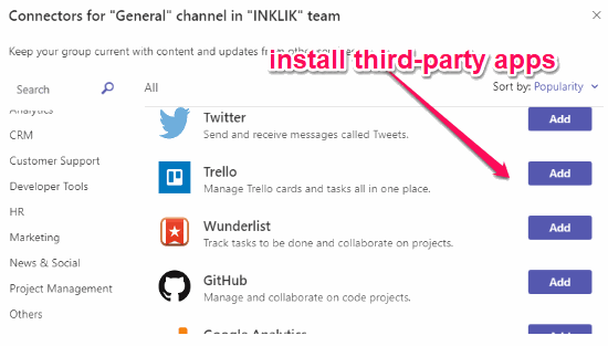Another useful feature of Microsoft Teams is that it lets you integrate and use more than 140 third-party apps. The apps are scattered across different categories including Analytics, CRM, Customer Support, Developer Tools, HR, Marketing, and more. Some of the popular apps which you can integrate are Twitter, Trello, Google Analytics, GitHub, Asana, Heroku, and more.