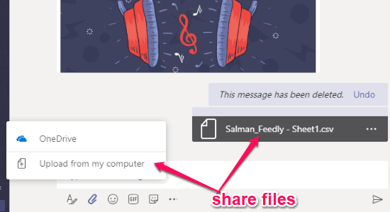 Apart from sending text messages, stickers, etc., you can also share different files (like images, documents, audio, video, and more) with your team members. To share a file, you would need to click on the “Attachment” icon visible in the message input field.