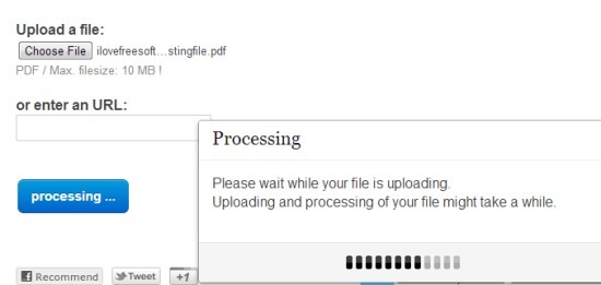 You can see main interface of ExtractPDF.com in above screenshot. To extract text, images, font, and metadata information of a pdf file, upload the desired file from your computer (max. 10 MB in size) by clicking on Choose File button. If you want, you can also provide URL of an online pdf file. Once after completing the upload process of pdf file, you can hit the Send file button after which you will shortly get the results.