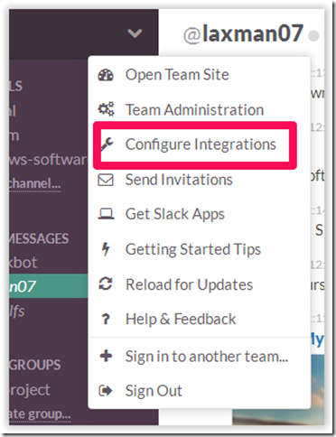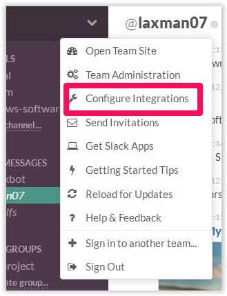 The Slack app can be integrated with various other productivity services like Google Docs, Google+ Hangouts, Github, Bugsnag, Bitbucket, Mail Chimp, RSS, and many more. To integrate any of the services, click on the option at top right corner labeled with your team’s name. Now, select Configure Integrations and choose the services you want to integrate.