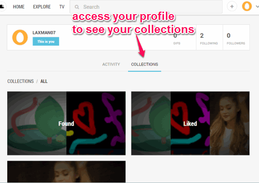 To add your gifs to a collection, you can tap on Folder icon. After this, you can create a new folder with desired name, and add that GIF to that folder. All your collections can be accessed by opening your Profile.