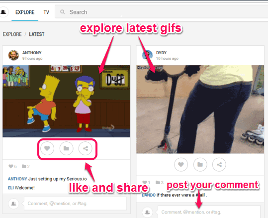 Serious is an awesome social network for animated gifs. It lets you find free animated GIFs, collect, and share them on your social accounts. You can explore all the GIFs uploaded on this website and can save any GIF to your PC without sign up. Moreover, you can also create a free account to like any GIF, create personal folders to store GIFs, and comment on any GIF.