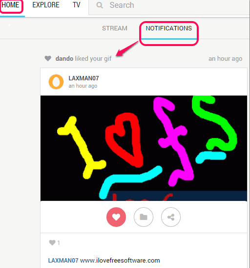 Apart from above mentioned features, it also lets you upload your own GIFs and share with others. However, it doesn’t let you set privacy for your GIFs. All uploaded GIFs are public.