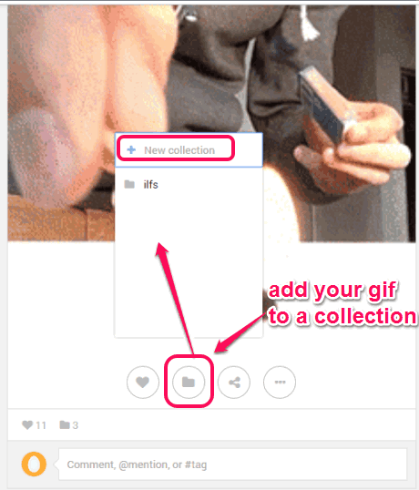 With every GIF, you will find option to like, share, comment, and add GIF to a collection. However, to use these options, you need to create a free account. You can use your Twitter, Google, or Facebook account to sign up.
