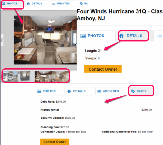 For each individual RV, you will be able to see photos, amenities, details of RV, and rates for that particular RV. Just scroll down the webpage and all details will be visible to you section by section. To rent that RV, tap on the Contact Owner button.