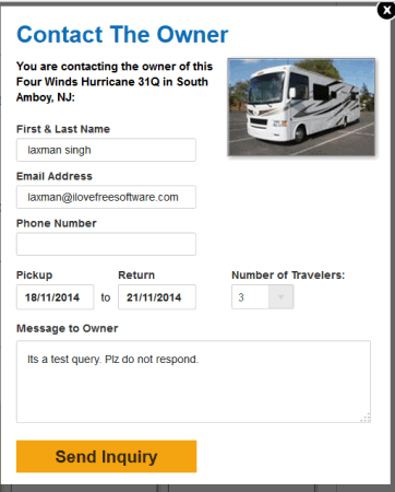 To contact/send inquiry to owner, you need to enter your first and last name, phone number, email address, pickup & return date, number of travelers, and a message (if want) to owner. Your query will be answered by owner.