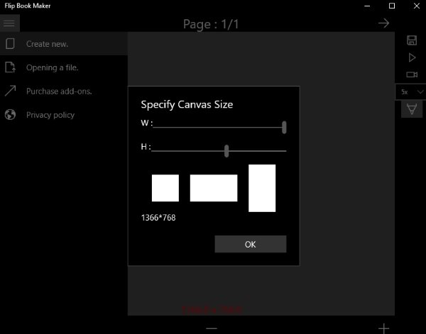 You will be asked to specify a canvas size for the flip book that you are creating. After specifying the size click the ok button and the canvas will open on your screen, as can be seen in the screenshot below.