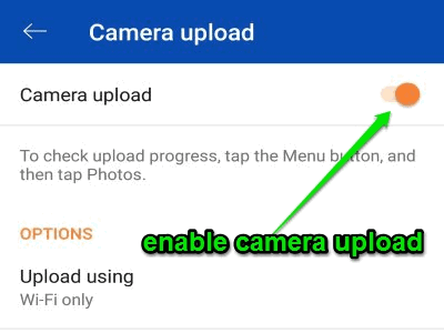 Step 2: Once you do that, the app interface will appear where you need to tap on the hamburger icon at the top to access “App Settings”. In the “Settings”, simply hit the “Camera Upload” option and turn it ON.