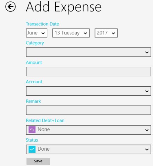 Start with entering the date of the expense, and the choose a category from the drop down menu. Enter the amount of expenses, the account which they were made from, etc. Save the entry at the end. By default there are limited categories mentioned in the app. But you can add more categories easily to the list. Go to the settings option of the app and there you will find the category tile. Click on this tile to open up the category page and add more categories to your list.