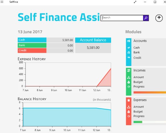 Selffina is a free Windows 10 personal finance management app which lets you manage your money easily and lets you generate finance reports in Excel format. You can manage your income, expenses, debts, budget, etc. You can add you bank account by name and starting balance in your account. Then keep updating the app with the transactions you make everyday. You can even monitor your finances through charts and graphs shown right on the home page of the app.