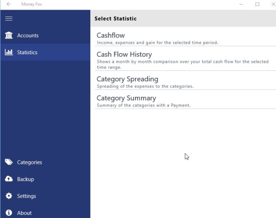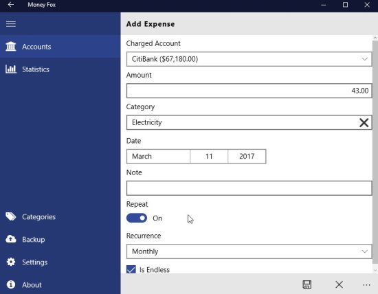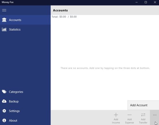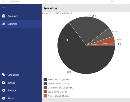 Money Fox is a Windows 10 personal finance tracking app which will show you your income, and expenses. You can create an account in the app and enter all the income first. Then start entering the expenses. This will show you how much money you have left with you and where you are spending most of your money. This app can help you keep an eye on your spending.