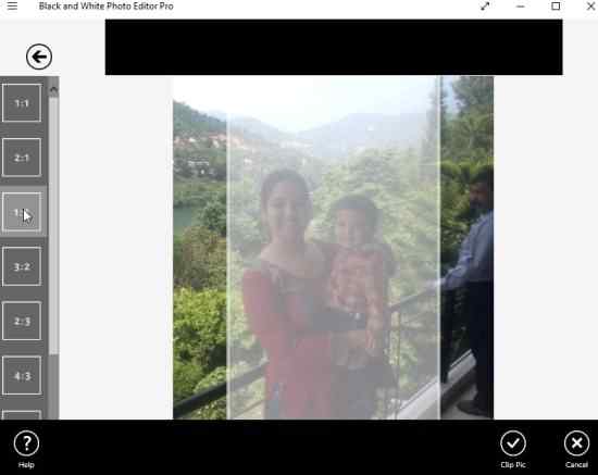 You can choose the aspect ratio you want your photo to be in and crop the photo accordingly. You can of course preview the aspect ratio before cropping. After this you will be taken to the main interface of your monochrome photo editor. All the options for editing can be seen on the left side of the screen.