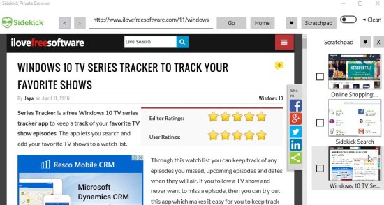 In the above screenshot you would notice a scratchpad on the right side of the window. The scratchpad lets you open or browse multiple websites without recording history like tabs. Scratchpad is wiped clean whenever you restart the browser app. The scratchpad can be accessed using the button with the same name on the top of the window.