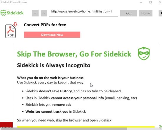 Sidekick Private Browser is a nice app to have a safe browsing session. It is always in incognito mode, does not record history, or tracks anything you browse. It blocks pop up ads and removes ads on pages. So it is safe to say that you can use this app to protect your privacy on the web and surf with out any worries. Just a reminder that this is not a standalone browser, it is rather a Windows 10 app which can be used in addition to your browser.