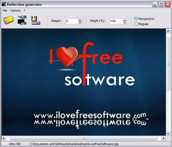 This is the toolbar of Reflet – area where you get all available tools. Use the extreme left option to browse the desired image on your system and Open it in Reflet. Next to it is the Animation option, used to create the final animation. But before you create the animation, you can adjust settings using the remaining options to customize your Photo according to your wish. The Images option displays the number of images that together combine to bring out that rippling wave effect. You can increase or decrease this number to fine tune the effect, and thereby, the speed of the wave. The Height option determines up to which level you want to create the reflection of the original image. Greater is the percentage, higher will be the reflection. Next, and the last option, lets you choose whether you want to create the perspective or regular rippling effect.