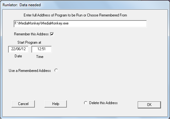 After you launch the program a window pops up where it asks you to enter a few details of the program you wish to launch at a specific time. The top bar has the option to paste the address of the program which you wish to run. Below it you have the option to set the date and time when you wish this program to start on its own. Then ‘’Use a Remembered address” presents you with the option of the already scheduled programs which you may have done before. And finally you just need to click on the ‘’Ok’’ button at the bottom to set the program to be run.
