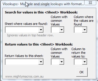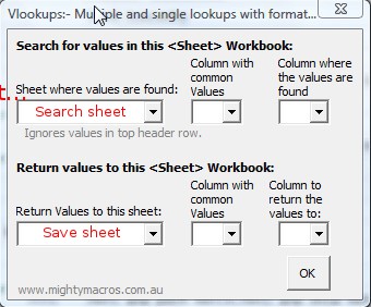 Screenshot above shows us the setup interface of this free multiple item lookup add-in for Excel. Top empty drop down menu is where the Spreadsheets from where you want to check for items have to be selected. Column on the far right is where you’ll be choosing where the values that you want to look-up are stored, in which column and lastly in the middle is the column where values that you want to lookup are selected. This add-in is actually a macro, and it will return the results which are found to a spreadsheet, which has to be selected in the bottom dropdown menu.