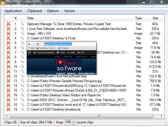 In screenshot above, you can see clipboard manager window of this software where all copied items are stored. It also provides total number of clips stored and their total size. File type and size of individual clip is also visible in its clipboard manager window.