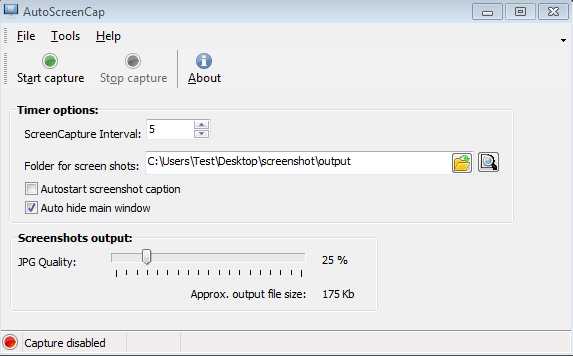 After everything is set, start creating screen caps by clicking on the Start capture button. Close the program to tray, you can leave it running as long as you want, and it will create screenshot after screenshot until you tell it to stop.