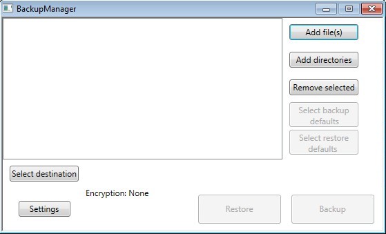 BackupManager is a very simple file backup utility, which can be seen from the screenshot of its interface below. Top left empty box is reserved for the list of files and folders that you decide to backup (or restore). Down below in the bottom left corner you can setup the output directory and also turn on password encryption, if you want it of course. On the right we have main controls with which you can add files and folders to the queue list, start/stop the backup, etc.