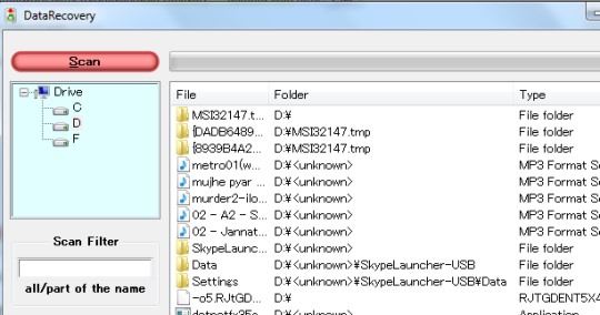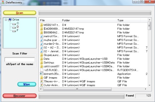 DataRecovery is a portable software so you can run it directly. It is quite simple to use and is very lightweight also. Apart from these useful features, it provides scan filter, like other similar data recovery software, using which you can search for a particular item. But one shortcoming with this data recovery software is that you cannot quickly sort images, music files, text files, etc., separately. All data will be mixed up in results.