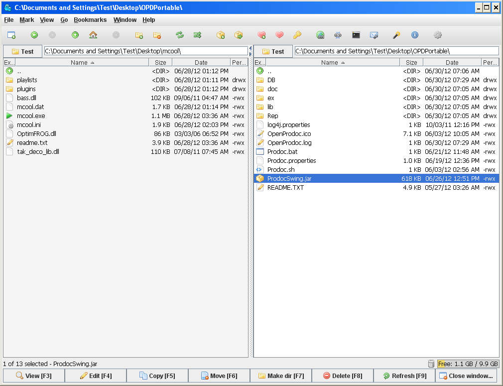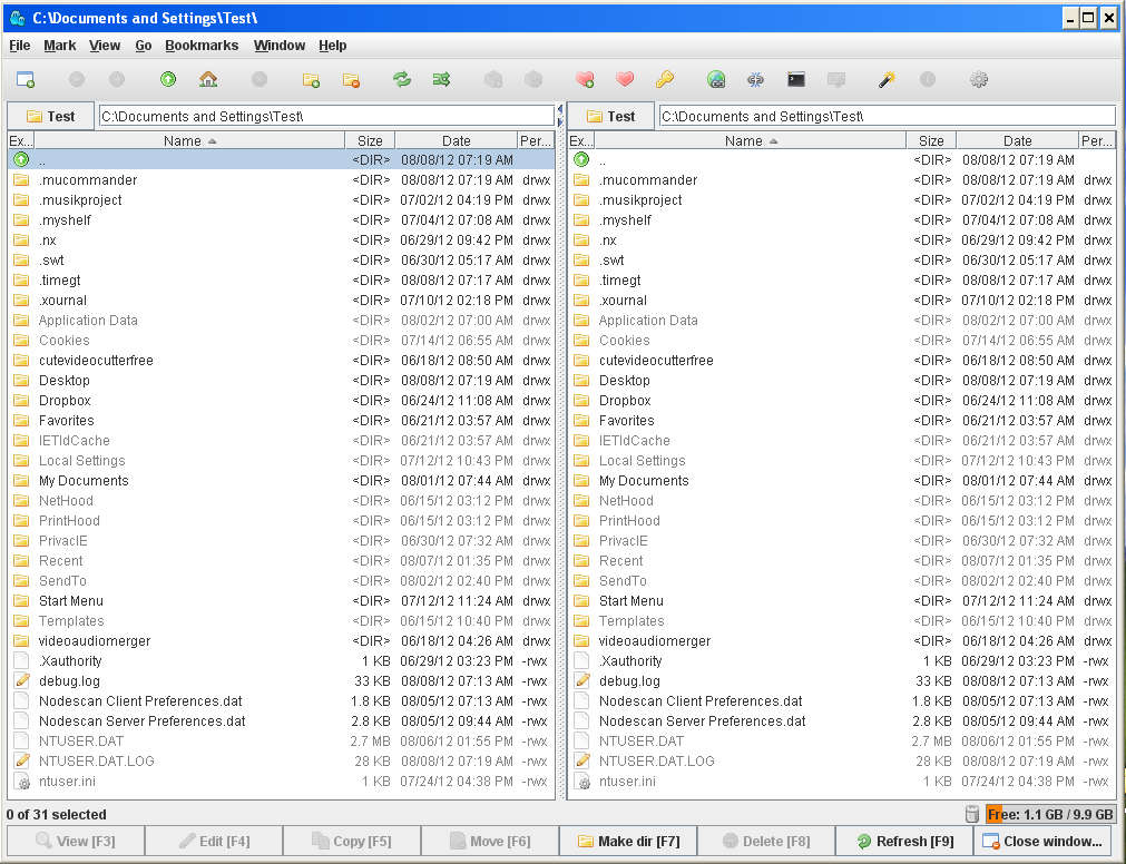 In each one of the panes open the locations where files that you want to manage are stored. To copy something you can either drag and drop files from one pane to another or click F6 while the files that you want to copy are marked. All the commands are located in the bottom part of the screen. You might also notice that there are some files present in your folder which normally aren’t there when you’re using Windows Explorer, those are the hidden system files which can be seen in muCommander.
