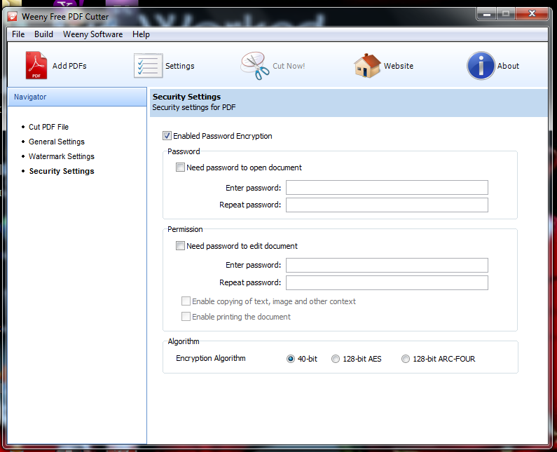 Password protection is also one of salient features of this PDF cutting software. You can enable the password encryption tab, for activating this feature. For anyone accessing this software, they will require passwords to open and edit the PDF. You can use password protection feature for even controlling the copying and printing of the PDF content. You can even select the encryption algorithm! There are three options provided for you to choose from.