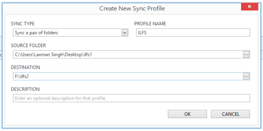 Step 2: Create a New profile using the option available at the top right corner. A new window will be in front of you. Here, you can add the profile name, source folder, and destination folder. The backup can be performed between two folders available in your PC, PC folder and folder available in USB drive, etc.