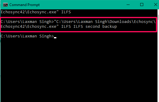 Step 2: Open Command Prompt window. Drag and drop the Echosync application. After that, you need to enter the profile name. You must enter the name as it is. So, your command would be: C:\Users\PC Name>”source location of Echosync application file” ProfileName. To add multiple profiles, you can give a space and enter the name of the second profile.