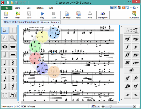 Crescendo Music Notation Software is the last software in this list that lets you edit MIDI files or create new sheet music. You can open multiple scores (or sheets) on its interface and add notes (quarter, half, sixteen, or eight). You will find multiple tools on the left side using which you can show your creativity to generate custom music sheets. Available tools are: selection tool, pan, bar line, tuplet, zoom, slur tool, etc. Options to insert text, change key signature, and time signature are also available.