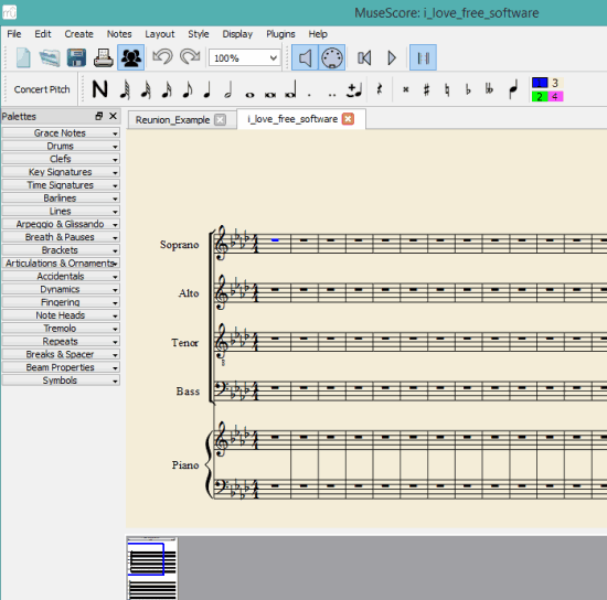 This software comes with multiple tools to create a beautiful sheet music. Apart from this, a bunch of palettes are available to use in your sheet music: Drums, Note Heads, Barlines, Lines, Breath & Pauses, Key Signatures, Time Signatures, and much more. To use a palette, you only have to drag n drop the symbols to your sheet music. You can also join MuseScore community to get sheet music, play those sheets, and improve your skills. It is surely a handy sheet music maker and a good competitor in this list.