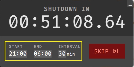 For example, if your system is about to shut down in 1 hr 45 minutes with the Interval set to 30 minutes and you click on ‘Skip, then it will shut down after 2 hrs 15 minutes.