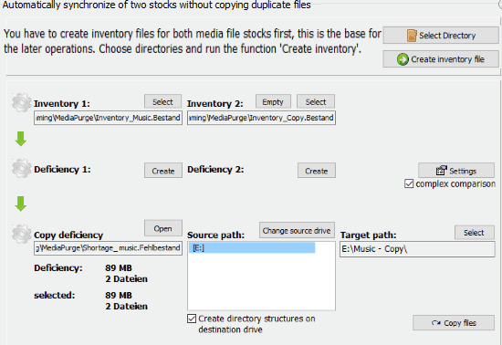 But in Mediapurge you can do it with just a few clicks that we will see a little later now. What it does is, it compares 2 folders and copies missing files to a specified directory. To perform this task you’ll first need to create inventory files of source and destination folder, then you have to create deficiency file of a folder in which you want to copy additional media files. These files are used for comparing folders and then copy missing files to specified directory.