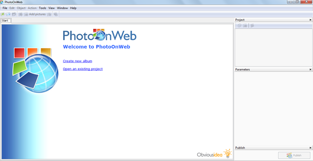 The moment you switch on the software the main screen appears displaying the Start tab. One would see a few options such as the “create a new album” and “open an existing project” on the left side. On the right side of the main screen are the three options namely: Project, Parameters and Publish.