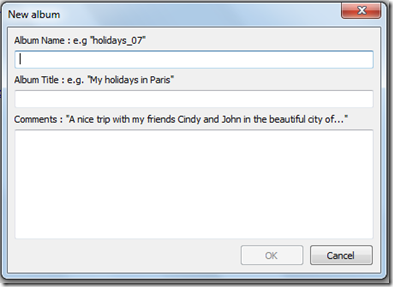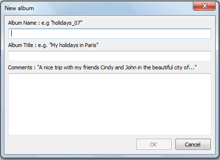 You could start with the process of creating your album by clicking on “create new album”. The Moment you click a new popup appears asking you to enter the album details (screenshot below).