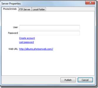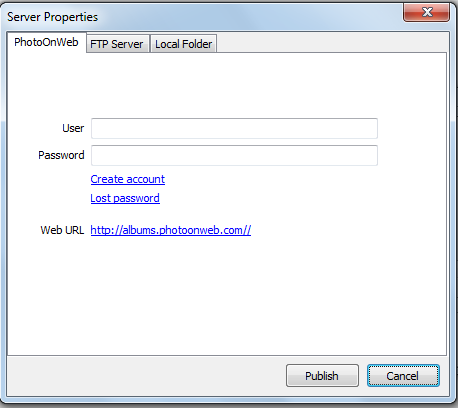 You may select any of the options you prefer whereby in case you don’t have the PhotoOnWeb user id you can always create one from the create account option. Moreover you can enter you FTP account details in case you wish to publish it over you FTP server.
