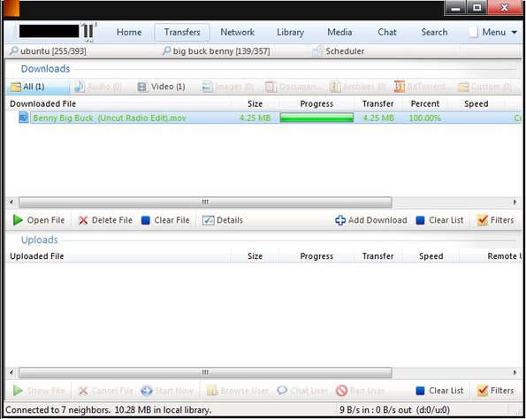 Download can be started like with any other file sharing utility. Double click and it will be moved to the Transfers section. From there you can keep track of the download progress and also upload down below, if you’ve decided to share files with the world.
