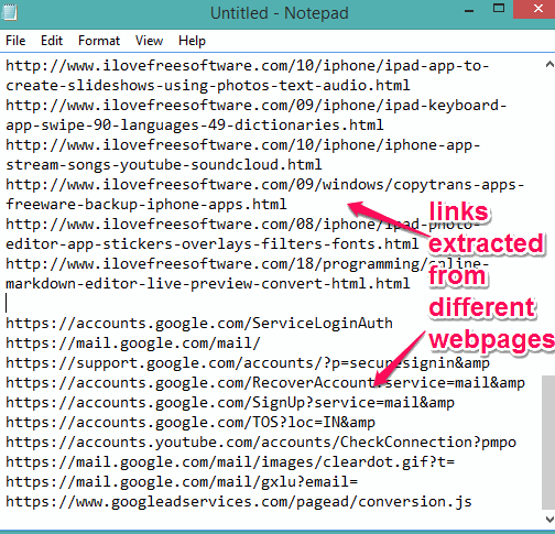 Below screenshot shows links extracted by me from different webpages using this Firefox add-on.