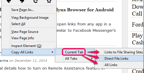 Copy All Links is a faster way to fetch links available in a particular webpage in currently active tab or in all tabs. I wish the developer included some hotkeys to use its options. Still, its context menu options are also sufficient to quickly copy links from webpages.