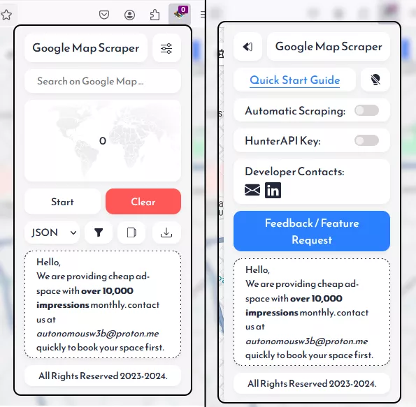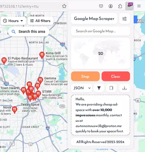 The extension lets you filter the data for specific parameters and can remove duplicate fields. You can also set it to automatically scrape the map without any human intervention. It provides the data output in JSON and CSV format. It also supports Hunter API integration for email scraping.