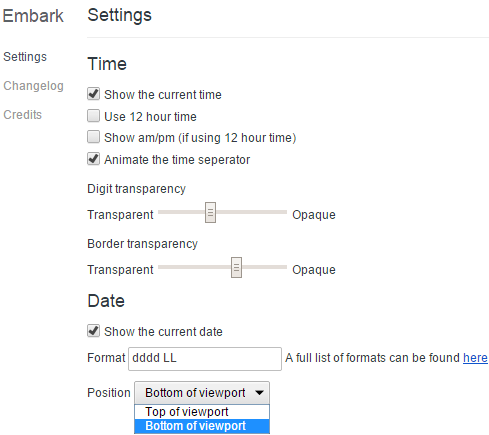 - Set position for the date. Date can be made visible on the bottom of the new tab page or on the top. Unfortunately, there is no option to set position for the time. It will remain at the center of the new tab page.
