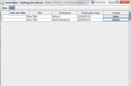 To use this software and keep a track of all the things which you require you need to key in the details in the respective cells. In all the above fields you need to insert the respective details of the job you are creating. In the ID field you can enter the ID no, the title field needs to be filled by the title about the description related to job, the enterprise field has to be filled by the enterprise name. Then in the next field named ”publication date” you need to enter the relevant date for the Job and lastly there is the delete field in case you wish to delete an input. At the top there is only the field and edit option. If you want to exit the software then you need to go in the files menu and to add another job offer you need to go in the edit option.
