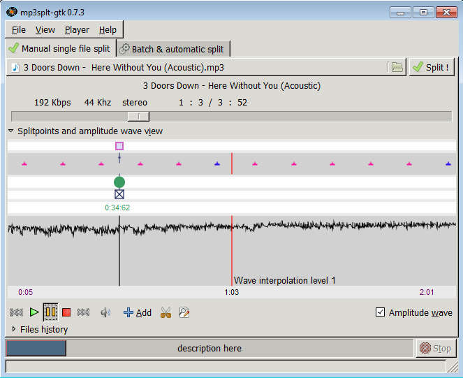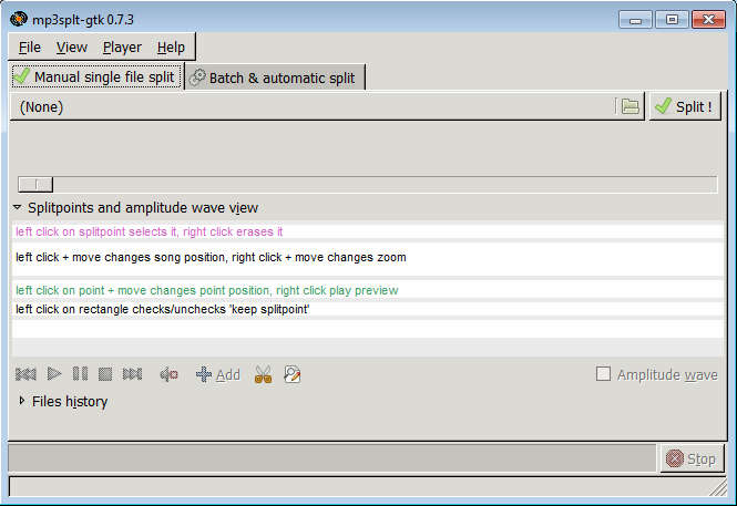 Amplitude view which can be seen at the bottom will not be available by default, you’re gonna have to active it by marking the check box in the lower right corner of the application window. To add split marks which are gonna tell the splitter where it needs to cut, you’re gonna have to play the song, by clicking on the play button, and once you come to the part where you need to split the song, hit the Add button to add the split marker. Add as many as you like or need, and once you’re done hit Split.