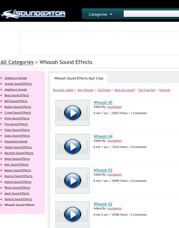One of the great things about this free online sound effect database is that you only need to register in order to start downloading audio effects. There’s no surveys or anything like that. Upon opening the homepage, search tool and categories are gonna be showed to you right away. All the way at the bottom you’ll also see recently added effects. Something that can’t be seen on the screenshot above are featured sound effects, they are also free.