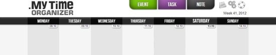 My Time Organizer offers three basic items which helps you in organizing your day: Events, Tasks, and Notes. You can add any of them to a specific day in calendar, just by dragging the icon with item name from the top panel and dropping it to the desired column (day).