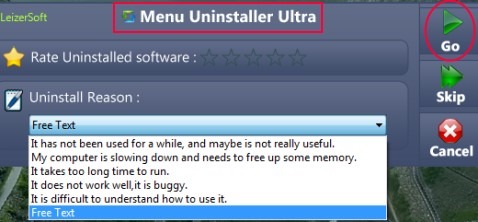 See the above screenshot showing you the interface of Menu Uninstaller Ultra software. Here you can give any of the available reason for uninstalling a program. Or if you want, you can use Free Text option in which you can write and submit your own reason. Give a reason, rate (out of 5) that program or application and hit the Go button. With this, you will be able to remove that program. And likewise, you can uninstall more than one program simultaneously using this software.
