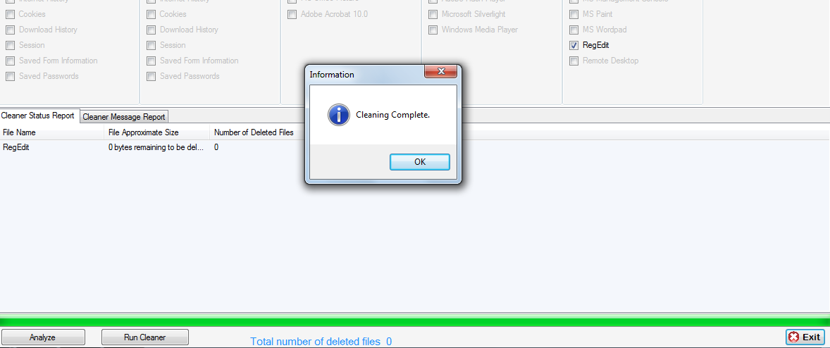 Below the applications there is a window where you can see the cleaner status report and cleaner message report. When you click on the settings tab in the left panel you will get a page where you can click near the options by tick marking them. There are only two options in the settings page, one is check for updates and other is applying default settings. To exit the software you need to click on the exit button in the footer at the right side.